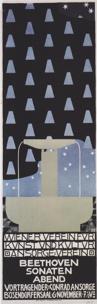 Ti offriamo una riproduzione artigianale su tela dell'opera famosa 'Manifesto del sonate di Beethoven serata' di Koloman Moser, dal Museo delle Riproduzioni.