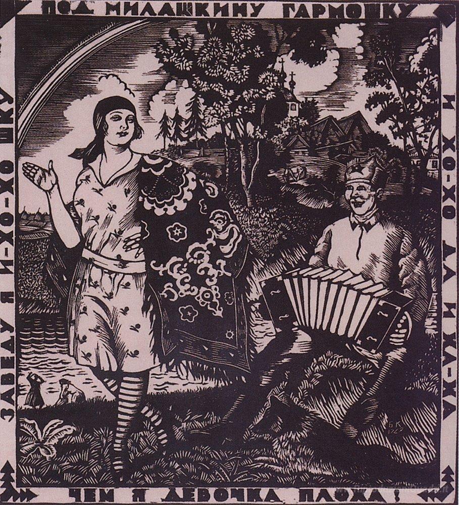 Ti offriamo una riproduzione artigianale su tela dell'opera famosa 'Sotto Harmonica di miele' di Boris Kustodiev, dal Museo delle Riproduzioni.