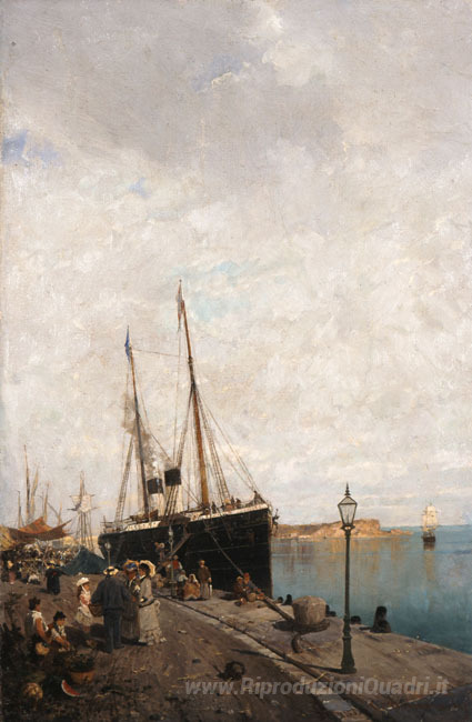 Ti offriamo una riproduzione artigianale su tela dell'opera famosa 'Al Molo' di Konstantinos Volanakis, dal Museo delle Riproduzioni.