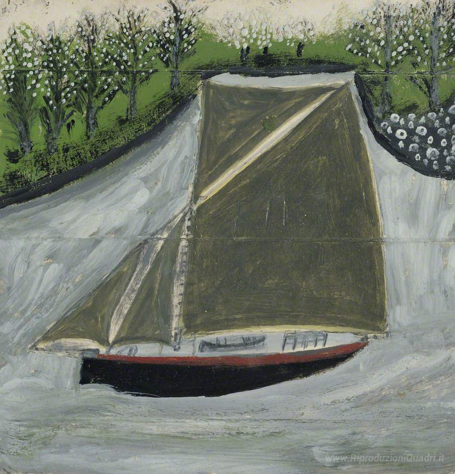 Ti offriamo una riproduzione artigianale su tela dell'opera famosa 'Barca a vela e Orchard 1937' di Alfred Wallis, dal Museo delle Riproduzioni.