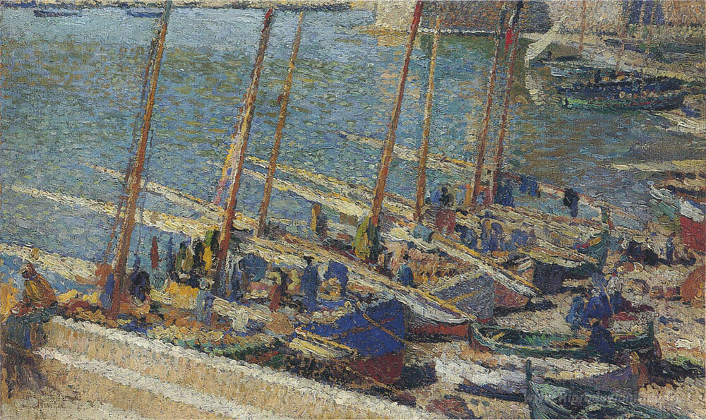 Ti offriamo una riproduzione artigianale su tela dell'opera famosa 'Barche a Port Collioure' di Henri Martin, dal Museo delle Riproduzioni.