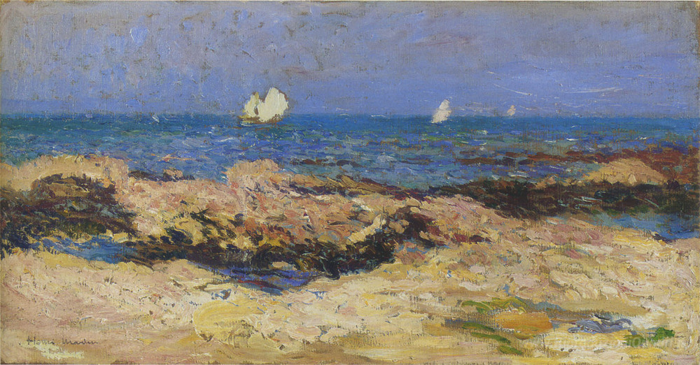 Ti offriamo una riproduzione artigianale su tela dell'opera famosa 'Barche a vela vicino alla costa' di Henri Martin, dal Museo delle Riproduzioni.