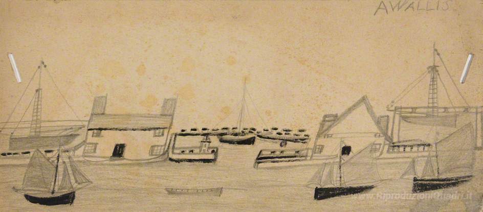 Ti offriamo una riproduzione artigianale su tela dell'opera famosa 'Case entrambi i lati della porta d'ingresso e Seven Barche' di Alfred Wallis, dal Museo delle Riproduzioni.