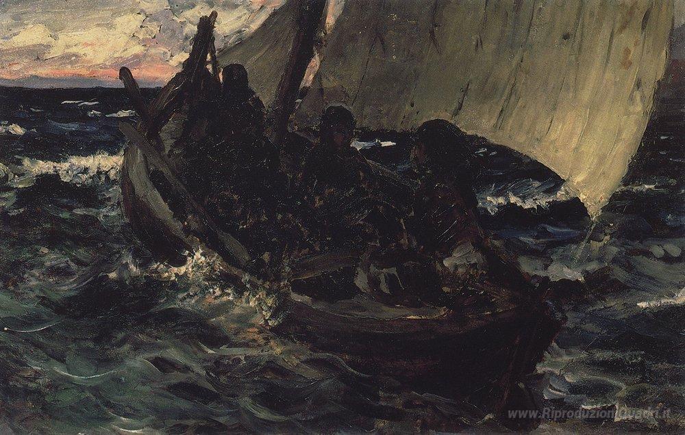 Ti offriamo una riproduzione artigianale su tela dell'opera famosa 'Chiatta' di Vasily Polenov, dal Museo delle Riproduzioni.