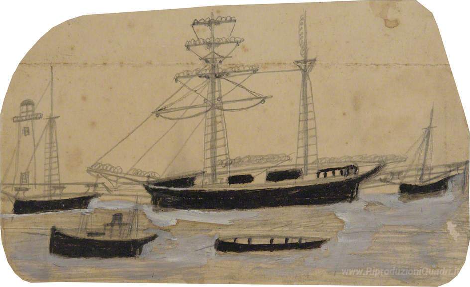 Ti offriamo una riproduzione artigianale su tela dell'opera famosa 'Cinque navi a Port con Lighthouse' di Alfred Wallis, dal Museo delle Riproduzioni.