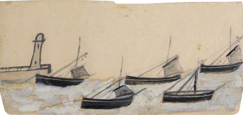 Ti offriamo una riproduzione artigianale su tela dell'opera famosa 'Cinque Pescherecci Ancorati da Pier e Faro' di Alfred Wallis, dal Museo delle Riproduzioni.