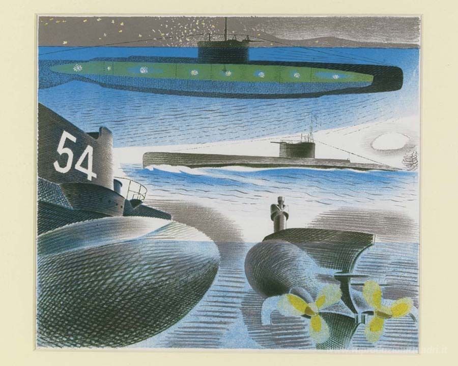 Questo dipinto è l’ideale per arricchire ogni ambiente, portando un tocco di eleganza e raffinatezza. La rappresentazione scenica dei sommergibili si integra armoniosamente con gli spazi moderni e tradizionali, contribuendo a un'atmosfera di contemplazione e innovazione. Aggiungi un'opera di Eric Ravilious alla tua collezione e lasciati ispirare dalla sua straordinaria visione artistica, che trasforma ogni stanza in un luogo di espressione e bellezza.