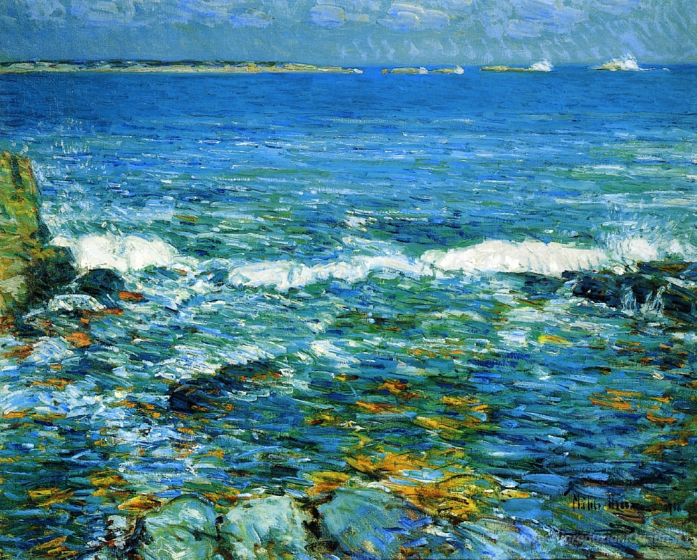 Ti offriamo una riproduzione artigianale su tela dell'opera famosa 'Duck Island da Appledore' di Childe Hassam, dal Museo delle Riproduzioni.