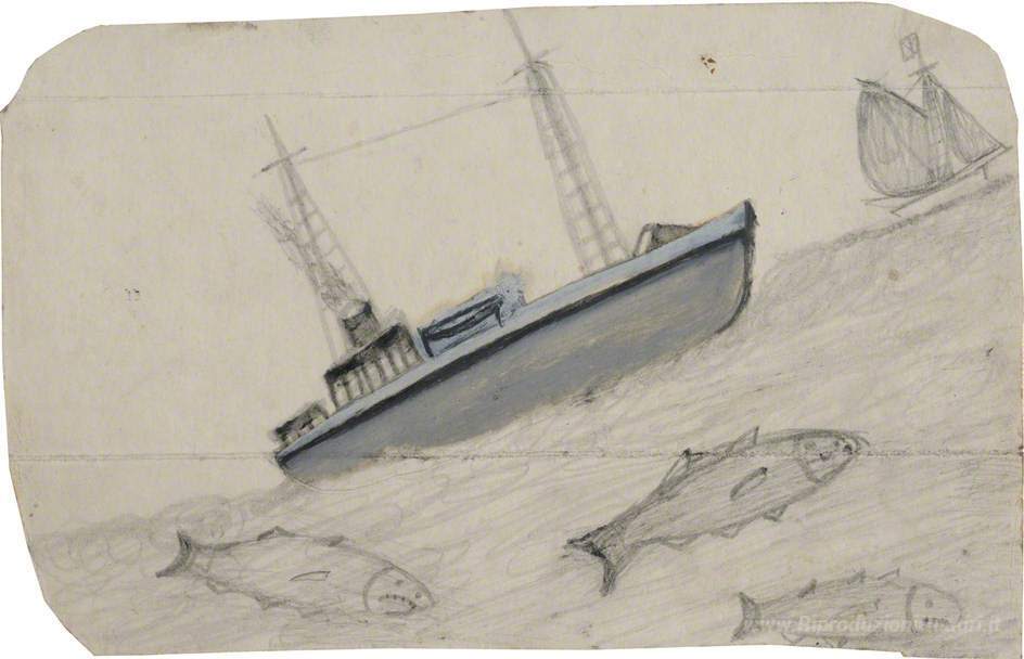 Ti offriamo una riproduzione artigianale su tela dell'opera famosa 'Grigio Steamboat, Barca a vela e Tre Pesci con i denti' di Alfred Wallis, dal Museo delle Riproduzioni.