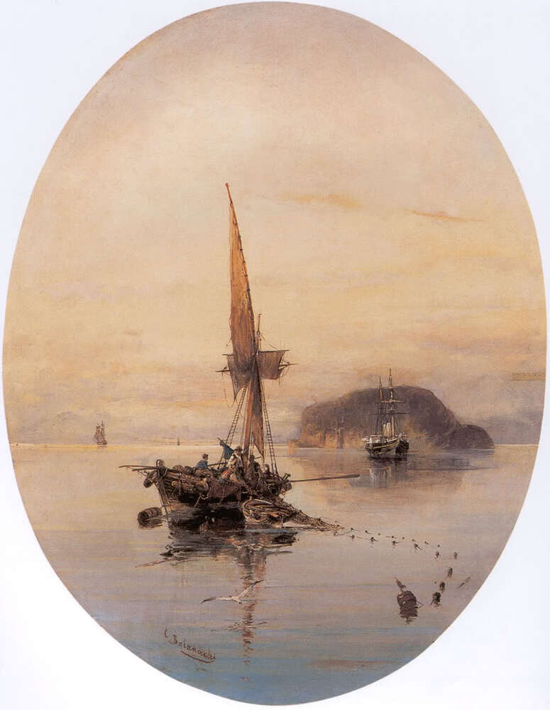 Ti offriamo una riproduzione artigianale su tela dell'opera famosa 'Il Fishnet' di Konstantinos Volanakis, dal Museo delle Riproduzioni.