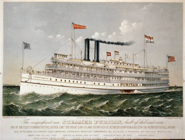 Ti offriamo una riproduzione artigianale su tela dell'opera famosa 'Il Steamer puritano, parte del 'vecchio' Fall River Linea' di Currier and Ives, dal Museo delle Riproduzioni.