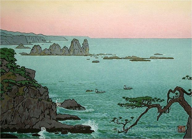 Ti offriamo una riproduzione artigianale su tela dell'opera famosa 'Irozaki, Mattina' di Toshi Yoshida, dal Museo delle Riproduzioni.