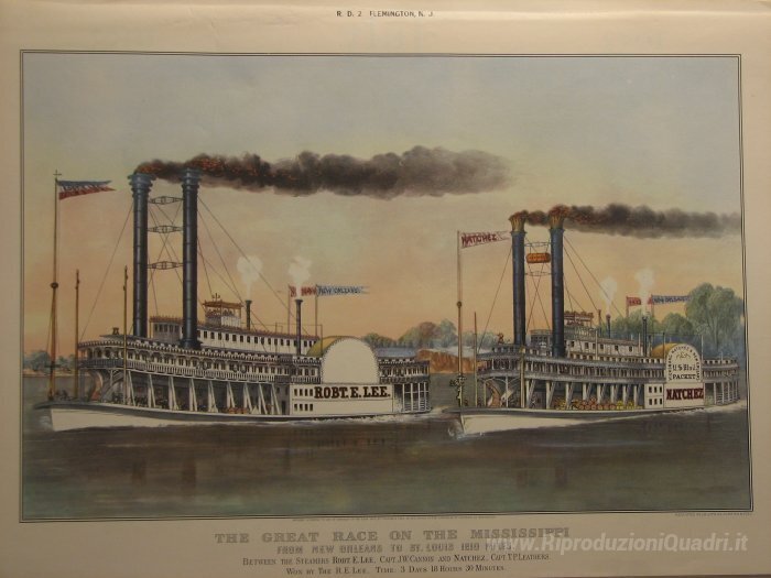 Ti offriamo una riproduzione artigianale su tela dell'opera famosa 'La Grande Corsa sul Mississippi' di Currier and Ives, dal Museo delle Riproduzioni.