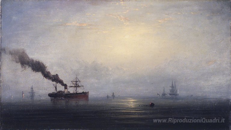 Ti offriamo una riproduzione artigianale su tela dell'opera famosa 'Mattina nebbiosa sul Tamigi' di James Hamilton, dal Museo delle Riproduzioni.