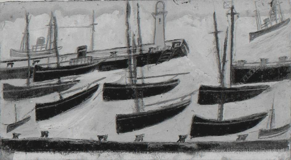 Ti offriamo una riproduzione artigianale su tela dell'opera famosa 'Nove navi in ??porto' di Alfred Wallis, dal Museo delle Riproduzioni.