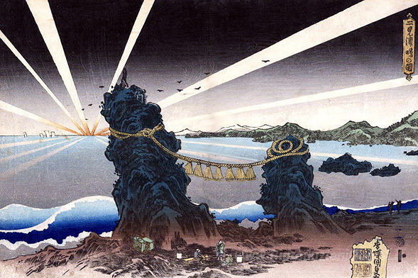 Ti offriamo una riproduzione artigianale su tela dell'opera famosa 'Paesaggio marino' di Utagawa Kunisada, dal Museo delle Riproduzioni.