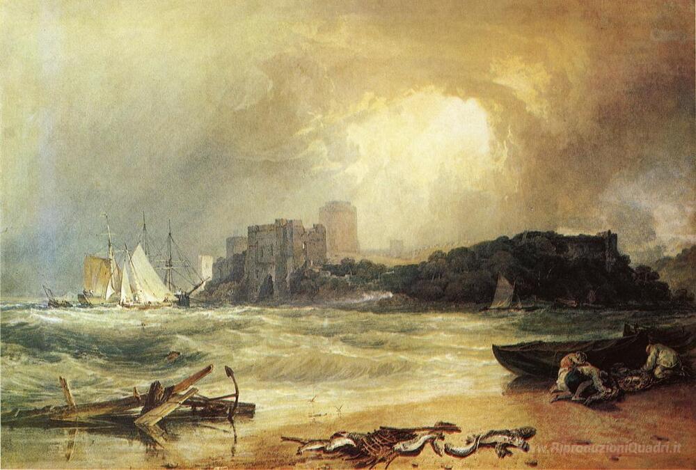 Ti offriamo una riproduzione artigianale su tela dell'opera famosa 'Pembroke Caselt, Galles del Sud, Thunder Approaching Storm' di William Turner, dal Museo delle Riproduzioni.