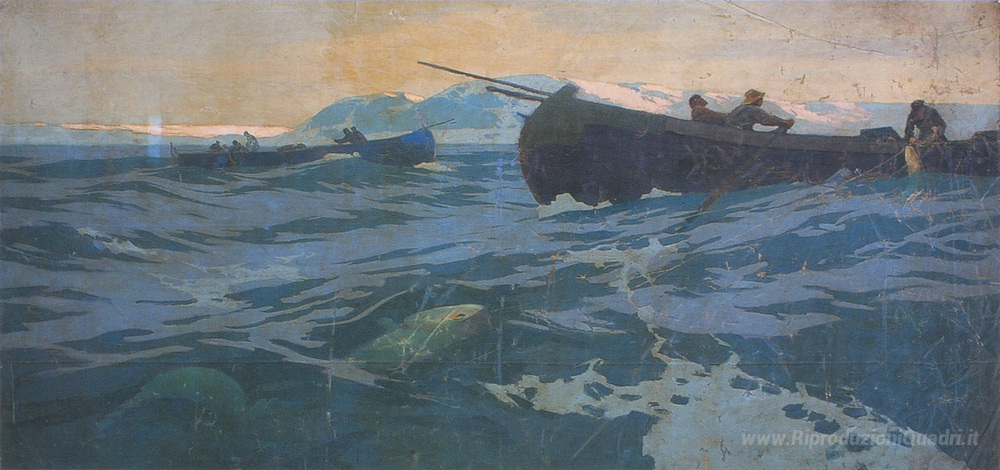 Ti offriamo una riproduzione artigianale su tela dell'opera famosa 'Pesca sul Murman Sea' di Konstantin Korovin, dal Museo delle Riproduzioni.