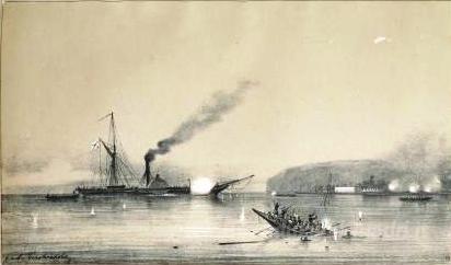Ti offriamo una riproduzione artigianale su tela dell'opera famosa 'Piroscafo Kolkhida combattere le barche turche presso il San Nic' di Alexey Bogolyubov, dal Museo delle Riproduzioni.