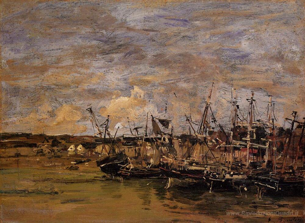 Ti offriamo una riproduzione artigianale su tela dell'opera famosa 'Portrieux Pescherecci con la bassa marea' di Eugene Boudin, dal Museo delle Riproduzioni.