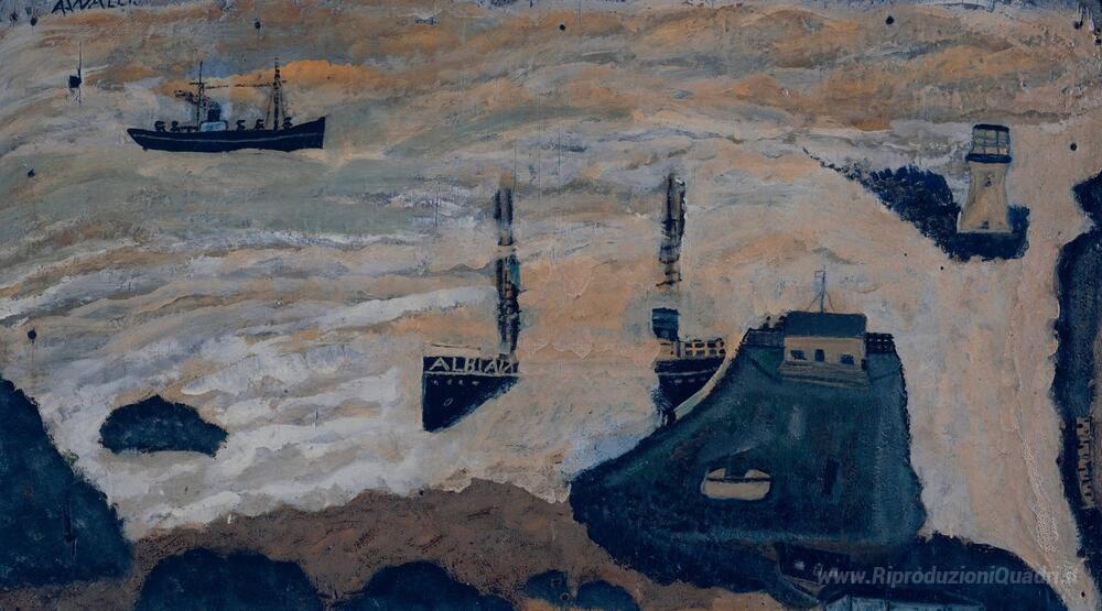 Ti offriamo una riproduzione artigianale su tela dell'opera famosa 'Relitto della Alba' di Alfred Wallis, dal Museo delle Riproduzioni.