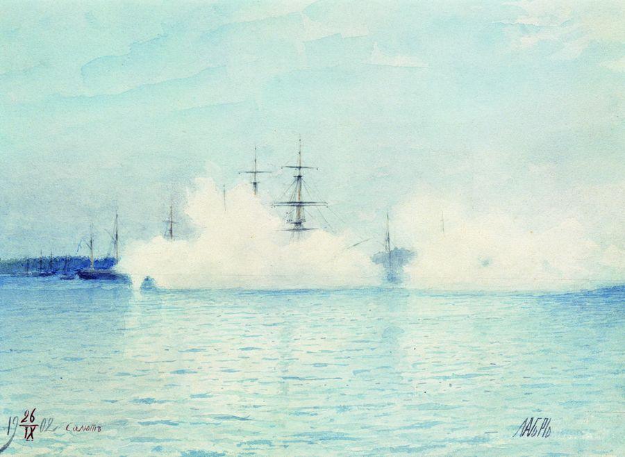 Ti offriamo una riproduzione artigianale su tela dell'opera famosa 'Salute 26 Settembre 1902' di Lev Lagorio, dal Museo delle Riproduzioni.