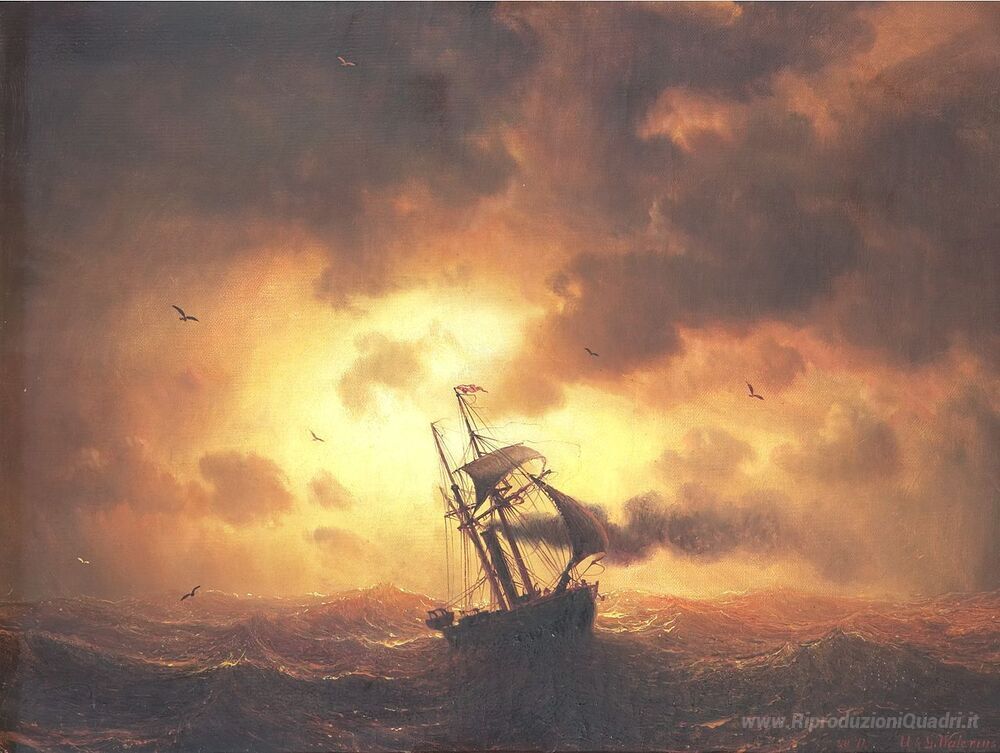 Ti offriamo una riproduzione artigianale su tela dell'opera famosa 'Stemship in Sunset' di Marcus Larson, dal Museo delle Riproduzioni.