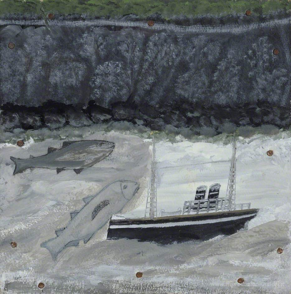 Ti offriamo una riproduzione artigianale su tela dell'opera famosa 'Terra, Pesce e motonave' di Alfred Wallis, dal Museo delle Riproduzioni.