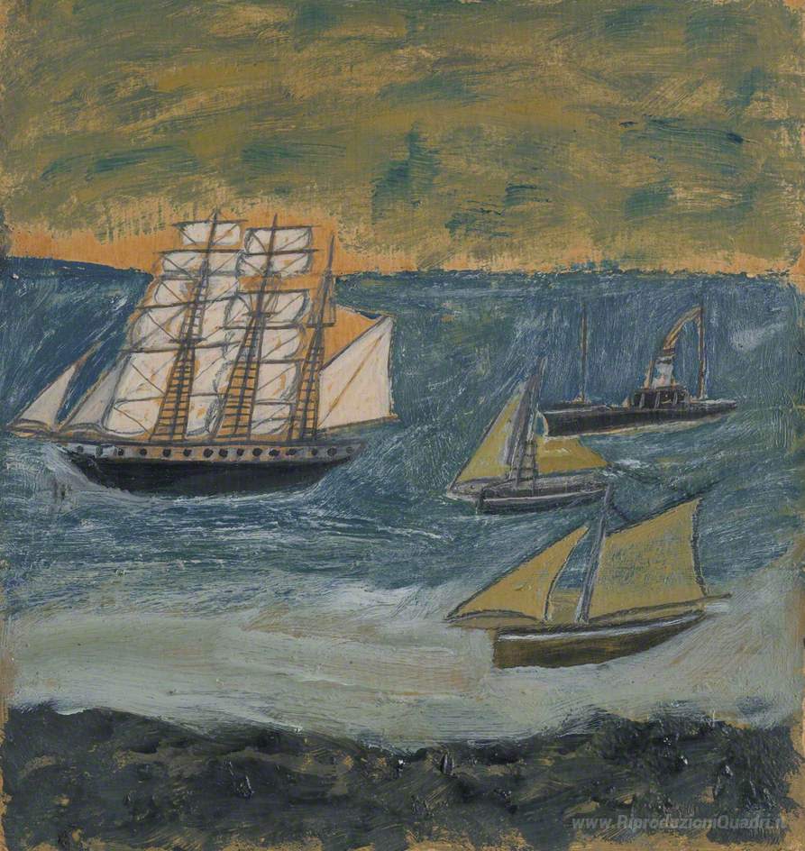 Ti offriamo una riproduzione artigianale su tela dell'opera famosa 'Tre alberi Barque con tre piccole navi' di Alfred Wallis, dal Museo delle Riproduzioni.