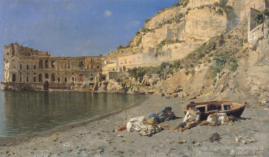Ti offriamo una riproduzione artigianale su tela dell'opera famosa 'Un Siesta in Sunshine' di Rubens Santoro, dal Museo delle Riproduzioni.