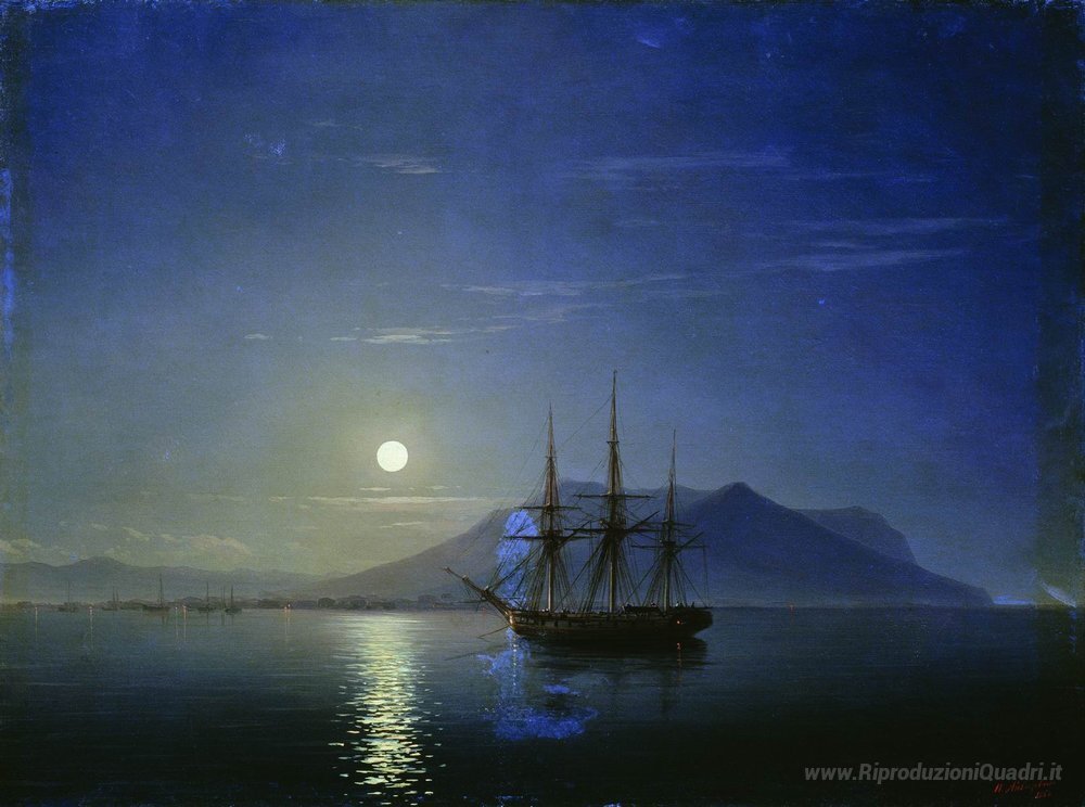 Ti offriamo una riproduzione artigianale su tela dell'opera famosa 'Vela al largo della costa della Crimea in notte di luna' di Ivan Aivazovsky, dal Museo delle Riproduzioni.