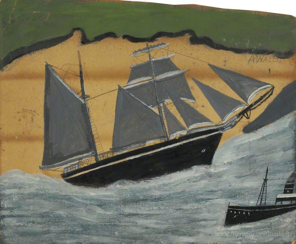 Scoprite l'incantevole opera Vela Nave contro una spiaggia di sabbia, realizzata dal maestro del primitivismo marittimo, Alfred Wallis. Questo dipinto, intriso di una profonda emozione e semplicità, cattura l'essenza della vita marina attraverso l'uso audace dei colori e forme. Wallis, un ex pescatore, ha saputo trasmettere con straordinaria abilità la sua passione per il mare, portando in ogni pennellata la freschezza della brezza marina e il calore del sole che bacia la sabbia.