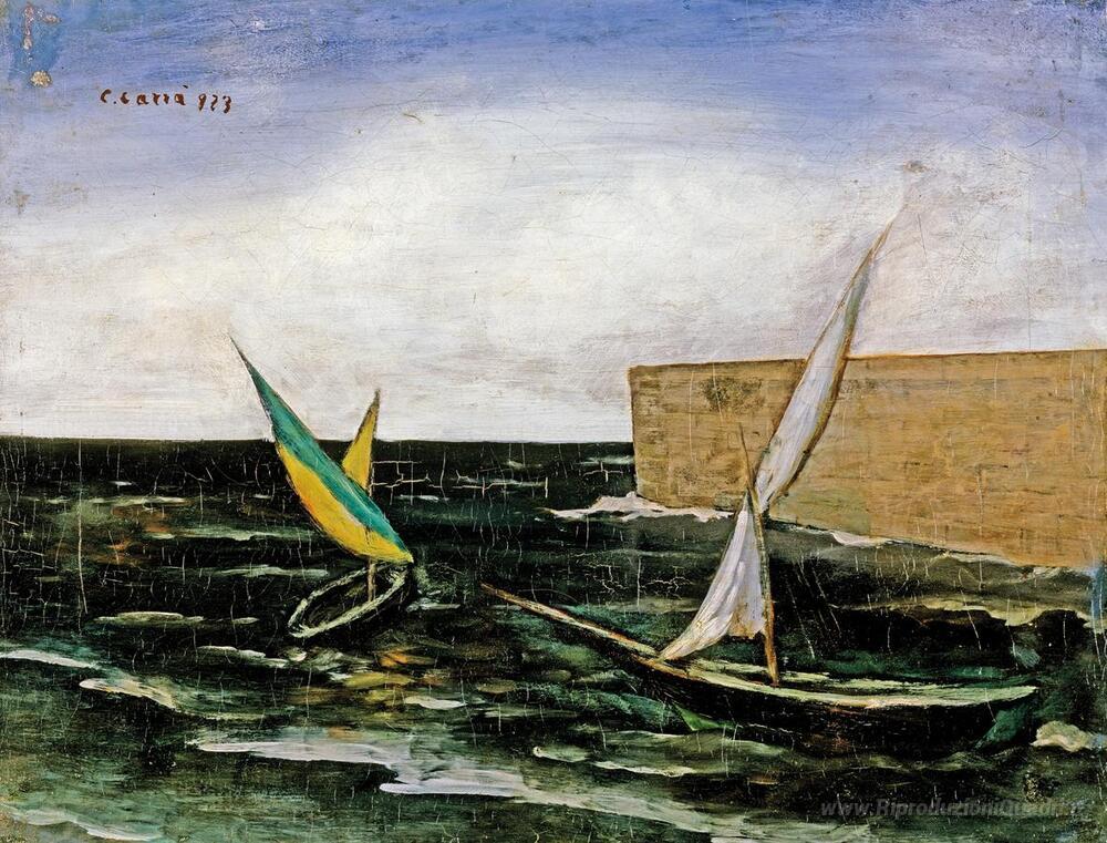 Ti offriamo una riproduzione artigianale su tela dell'opera famosa 'Vele nel porto' di Carlo Carra, dal Museo delle Riproduzioni.