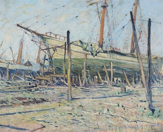 Ti offriamo una riproduzione artigianale su tela dell'opera famosa 'Velieri sullo Scalo a Viareggio' di Galileo Chini, dal Museo delle Riproduzioni.