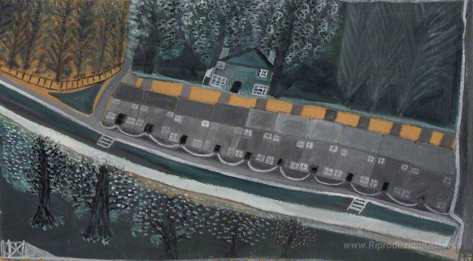 Ti offriamo una riproduzione artigianale su tela dell'opera famosa 'Via di case e alberi' di Alfred Wallis, dal Museo delle Riproduzioni.
