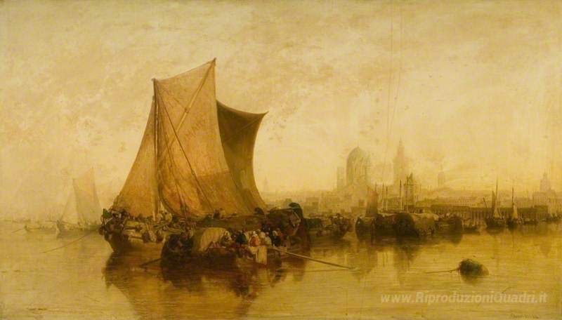 Ti offriamo una riproduzione artigianale su tela dell'opera famosa 'Vista di Magonza, in Germania, con Mercato barche' di James Webb , dal Museo delle Riproduzioni.