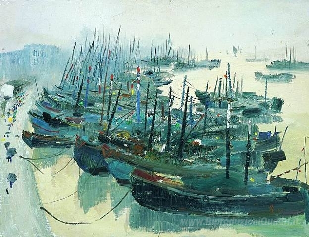 Ti offriamo una riproduzione artigianale su tela dell'opera famosa 'Zhoushan Harbour' di Wu Guanzhong, dal Museo delle Riproduzioni.
