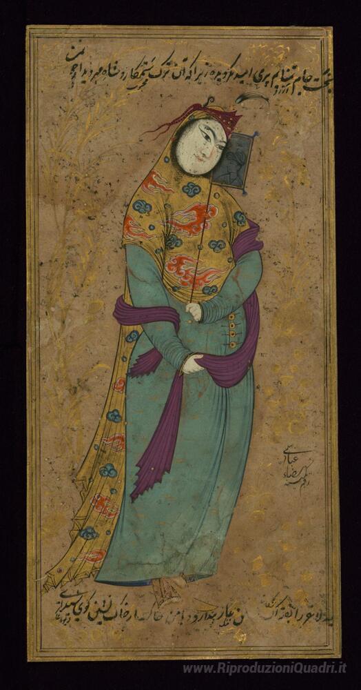 Ti offriamo una riproduzione artigianale su tela dell'opera famosa 'A Lady con un fan' di Reza Abbasi, dal Museo delle Riproduzioni.