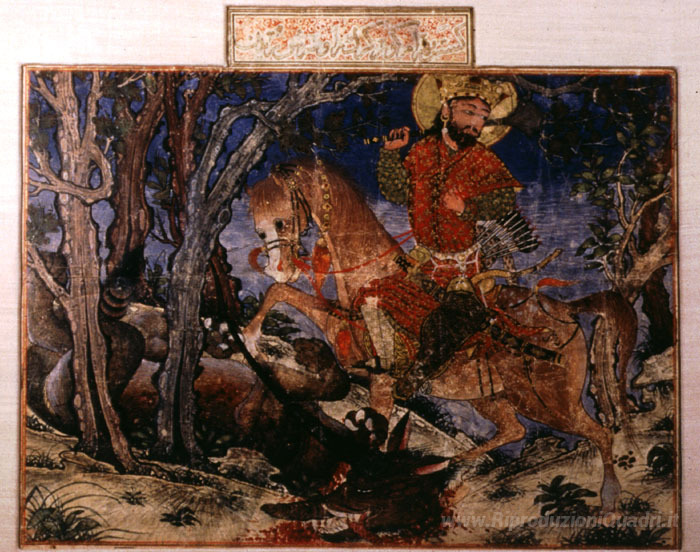 Ti offriamo una riproduzione artigianale su tela dell'opera famosa 'Bahram Gur uccide il lupo' di Ahmad Musa, dal Museo delle Riproduzioni.