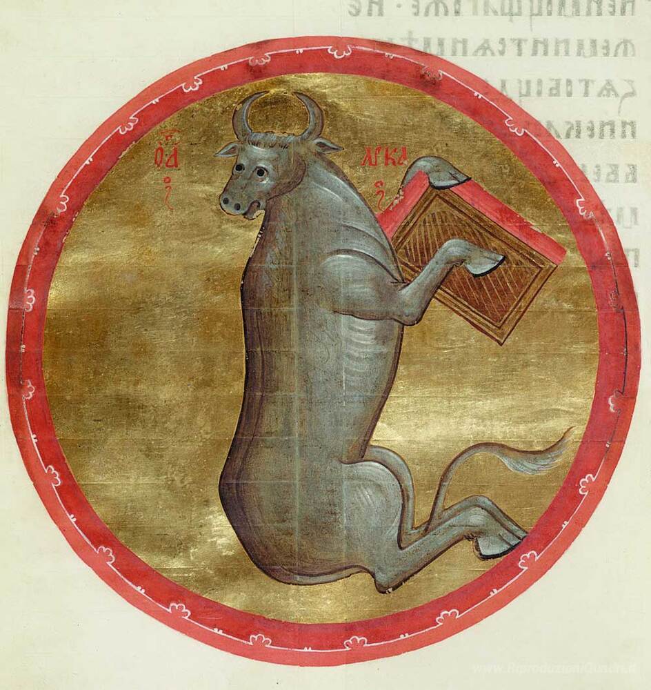 Ti offriamo una riproduzione artigianale su tela dell'opera famosa 'Il Vitello di San Luca' di Andrei Rublev, dal Museo delle Riproduzioni.