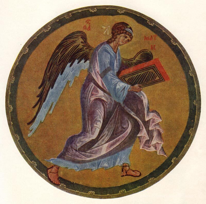 Ti offriamo una riproduzione artigianale su tela dell'opera famosa 'L'Angelo di Matteo' di Andrei Rublev, dal Museo delle Riproduzioni.