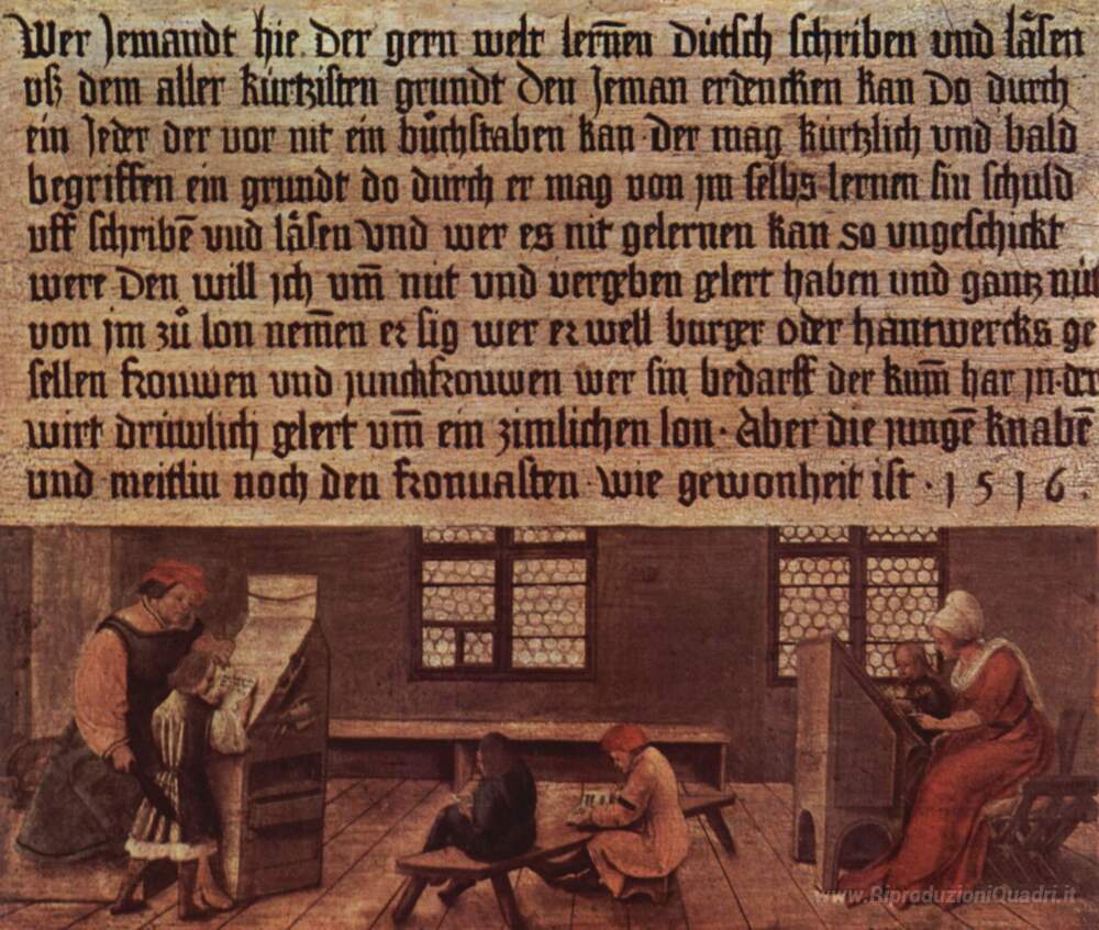 Ti offriamo una riproduzione artigianale su tela dell'opera famosa 'Principi di un maestro di scuola, l'insegnamento scena per i bam' di Hans Holbein the Younger, dal Museo delle Riproduzioni.