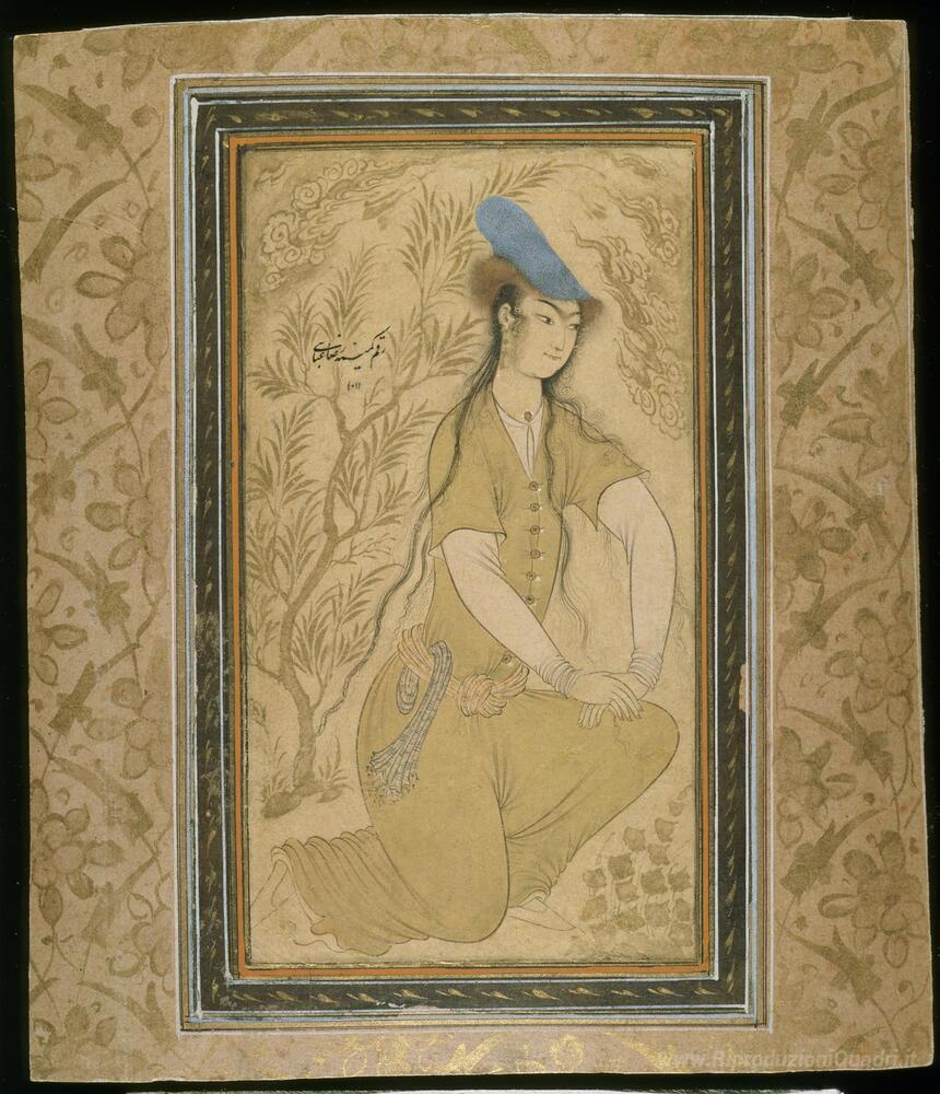 Ti offriamo una riproduzione artigianale su tela dell'opera famosa 'Ragazza' di Reza Abbasi, dal Museo delle Riproduzioni.