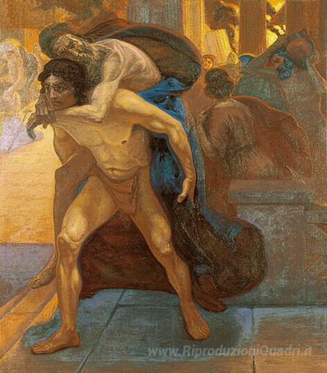 Ti offriamo una riproduzione artigianale su tela dell'opera famosa 'Aeneas salvare suo padre attraverso le fiamme di Troia' di Emmanuel Zairis, dal Museo delle Riproduzioni.