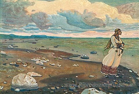 Ti offriamo una riproduzione artigianale su tela dell'opera famosa 'Al di là dei mari ci sono le grandi terre' di Nicholas Roerich, dal Museo delle Riproduzioni.