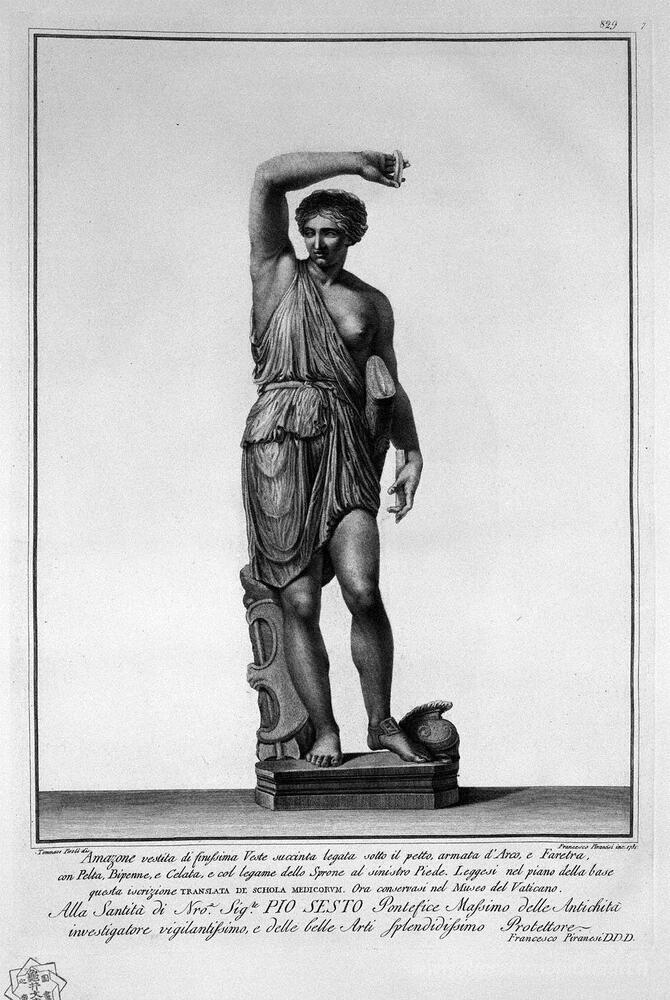 Ti offriamo una riproduzione artigianale su tela dell'opera famosa 'Amazone' di Giovanni Battista Piranesi, dal Museo delle Riproduzioni.