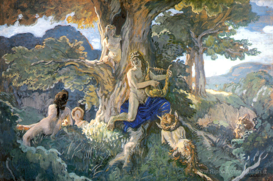 Ti offriamo una riproduzione artigianale su tela dell'opera famosa 'Apollo e Dafne' di Alexandre Benois, dal Museo delle Riproduzioni.