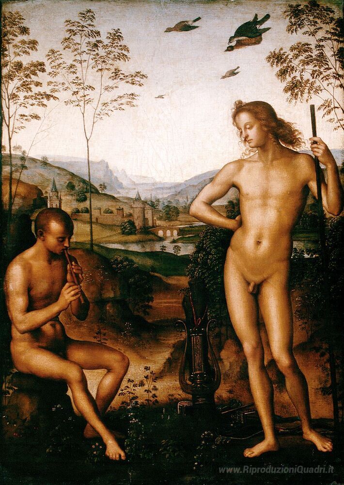 Ti offriamo una riproduzione artigianale su tela dell'opera famosa 'Apollo e Marsia' di Pietro Perugino, dal Museo delle Riproduzioni.