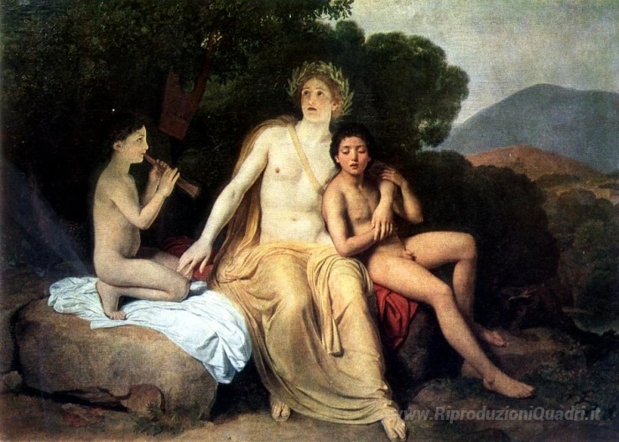 Ti offriamo una riproduzione artigianale su tela dell'opera famosa 'Apollo, Giacinto e Cypari cantare e suonare' di Alexander Ivanov, dal Museo delle Riproduzioni.