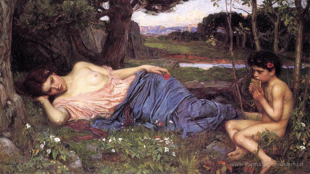 Ti offriamo una riproduzione artigianale su tela dell'opera famosa 'Ascoltare i miei Tubazioni Dolci' di John William Waterhouse, dal Museo delle Riproduzioni.